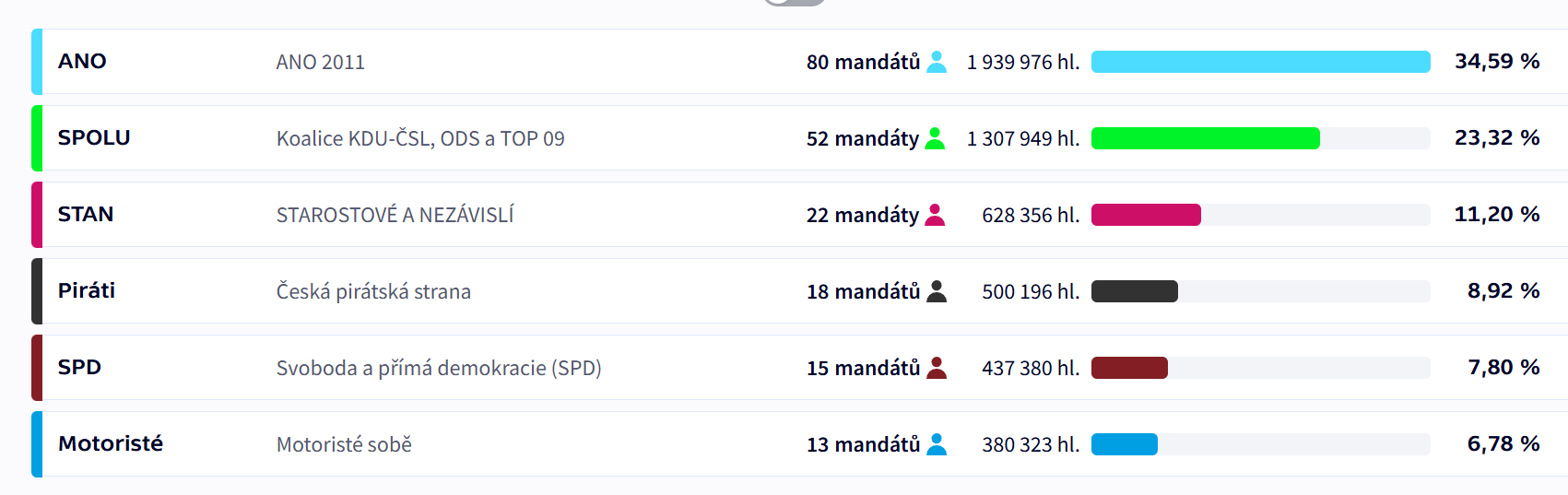 Wyniki z 99,92 proc. okręgów wskazują, że wybory parlamentarne w republice Czeskiej wygrał ruch ANO Andreja Babiša z wynikiem 34,58 proc. głosów. Współrządca koalicja Spolu otrzymała poparcie 23,32 proc. Trzecie miejsce na podium przypadło Burmistrzom, na których oddało głos 11,20 proc. wyborców. Za nimi uplasowali się Piraci z wynikiem 8,92 proc., a następnie SPD Tomia Okamury z 7,79 proc. i Kierowcy 6,78. Do Izby Poselskiej nie dostali się komuniści z bloku Dość!